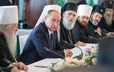 Президент России Владимир Путин (слева) во время встречи с патриархом Московским и всея Руси Кириллом и иерархами РПЦ и представителями делегаций поместных православных церквей на юбилейных торжествах к 700-летию со дня рождения преподобного Сергия Радонежского. Встреча прошла в Троице-Сергиевой лавре.