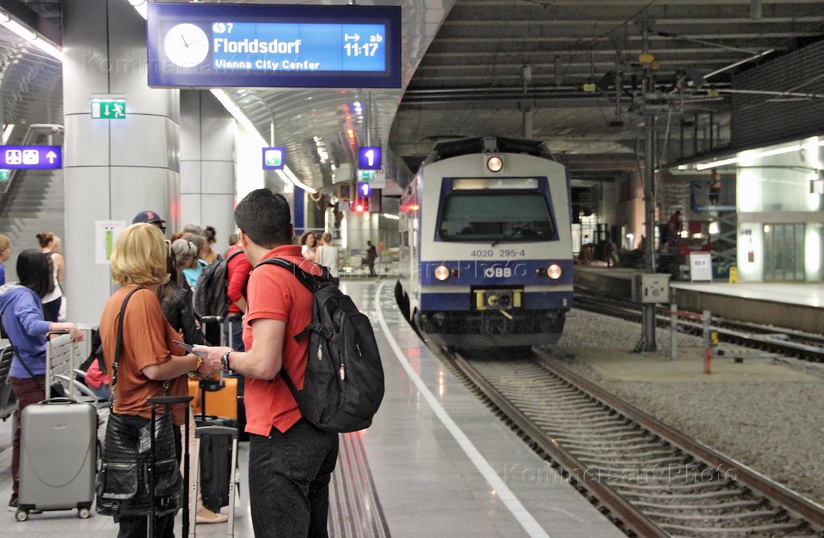 Железодорожная станция в международном аэропорту Швехат. Прибытие пригородного поезда.