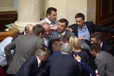 Заседание Верховной Рады Украины. Народный депутат Верховной рады Украины (ВРУ) от фракции Партии Регионов Вадим Новинский и депутат ВРУ от фракции Коммунистической партии Украины Адам Мартынюк (слева обнимаются) и представители фракции Коммунистической партии Украины на заседании ВРУ.
