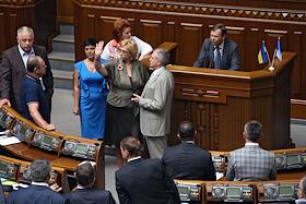 Народные депутаты Верховной рады Украины от фракции "Партии регионов Украины" (ПР) Таисия Повалий (слева) и Ярослав Сухой (справа) на заседании Верховной Рады Украины (ВРУ).