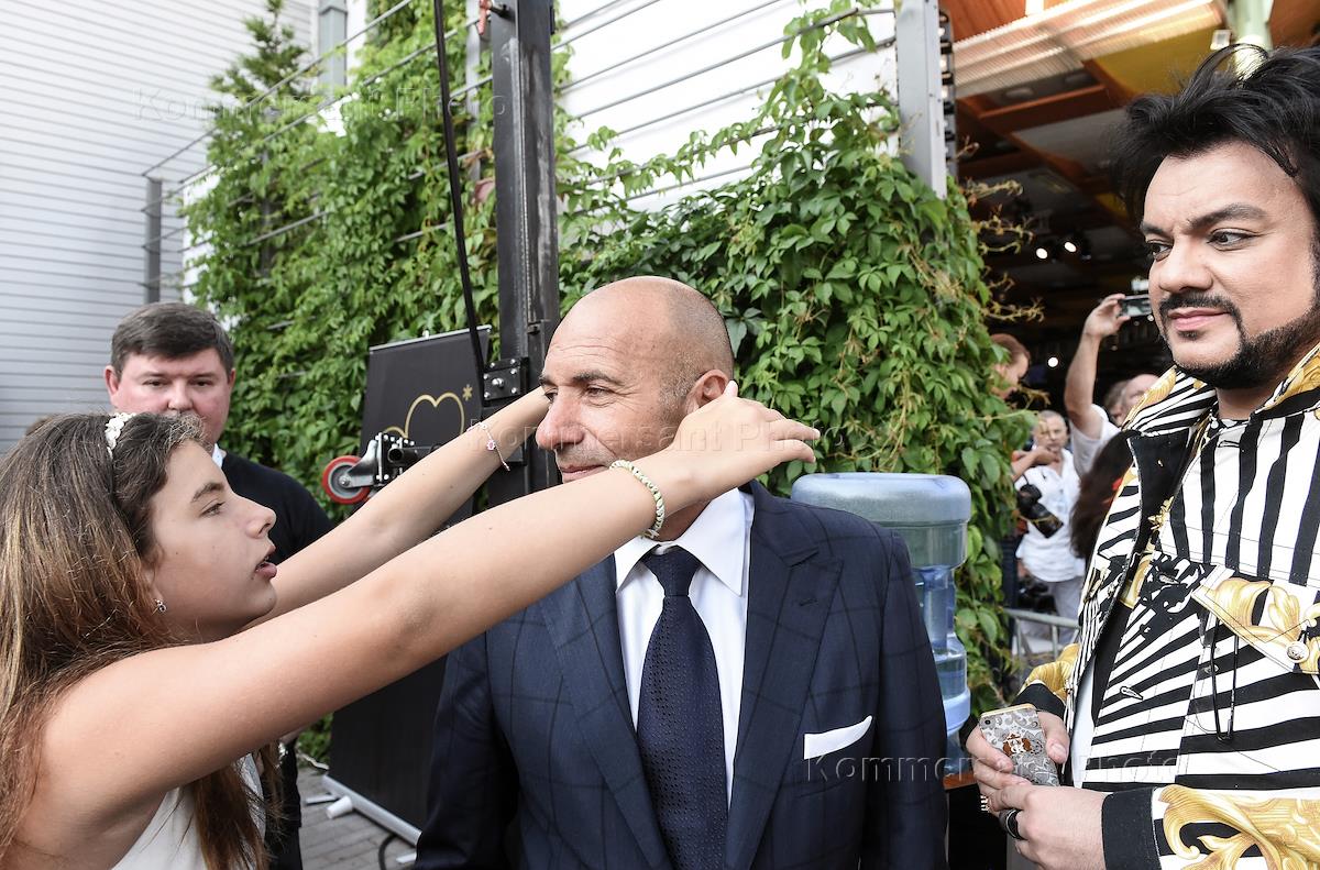 Музыкальный фестиваль "Новая Волна". Композитор Игорь Крутой (в центре) c дочерью Александрой (слева) и певец Филипп Киркоров (справа) перед началом творческого вечера Аллы Пугачевой в Юрмале.