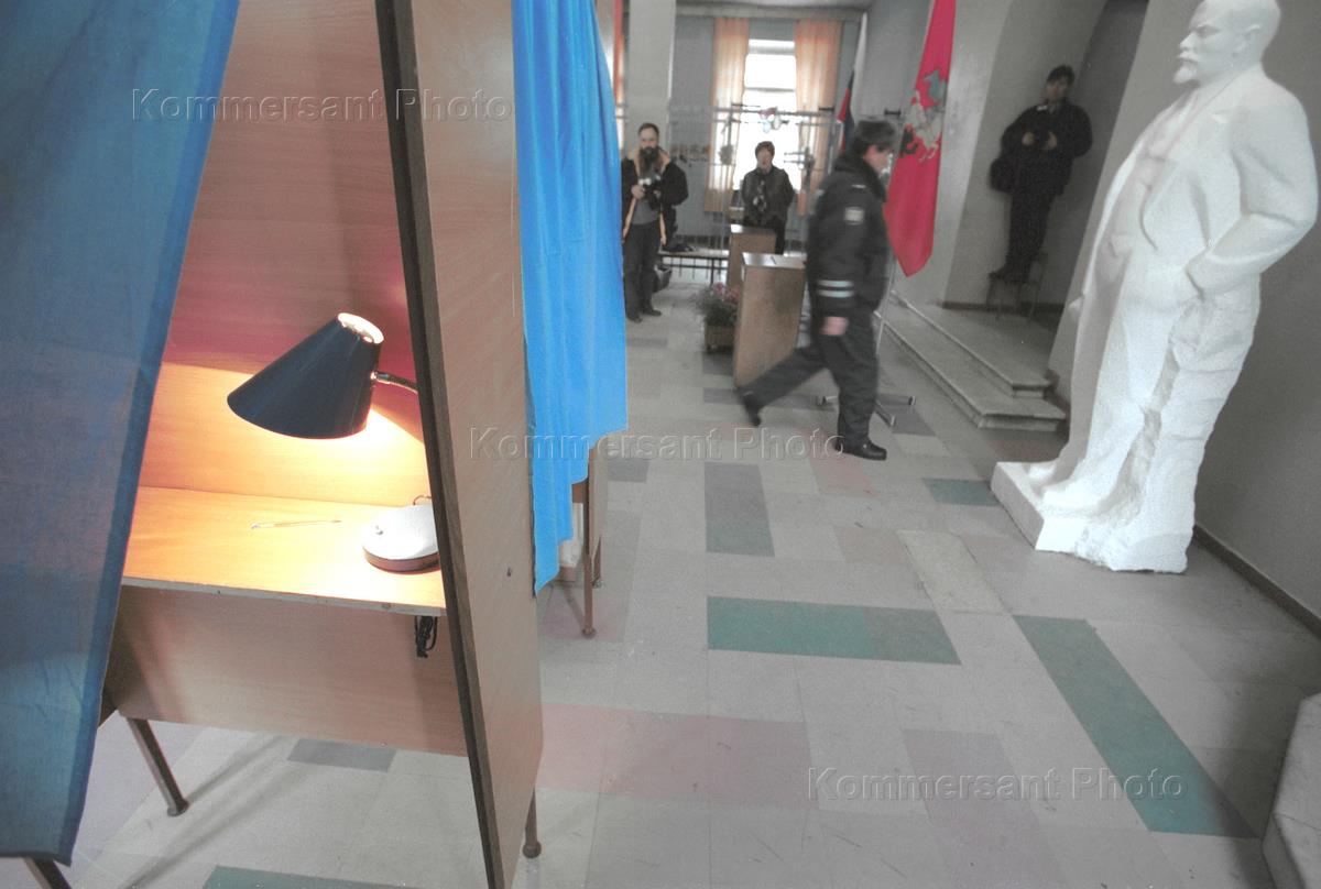 Polling station at Miusskaya street before the arrival of Communist Party leader Gennady Zyuganov. A lamp is turned on the the cabine. Police officers and photogrphers waits for the important person. Lenin's sculpture is seen near the wall.