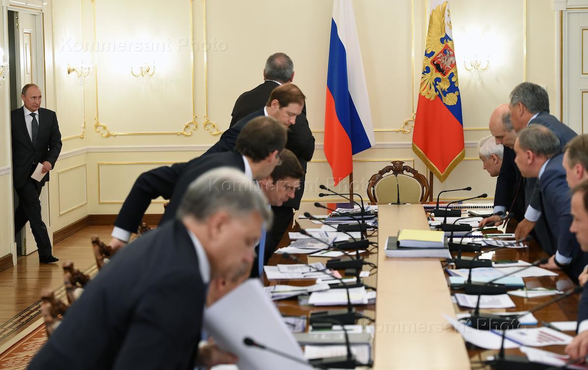 Russian President Vladimir Putin (in the centre) and the assistant of Russian President Andrey Belousov (the 5th from right) during meeting about import substitution in military-industrial complex. The meeting held in Novo-Ogarevo residence.