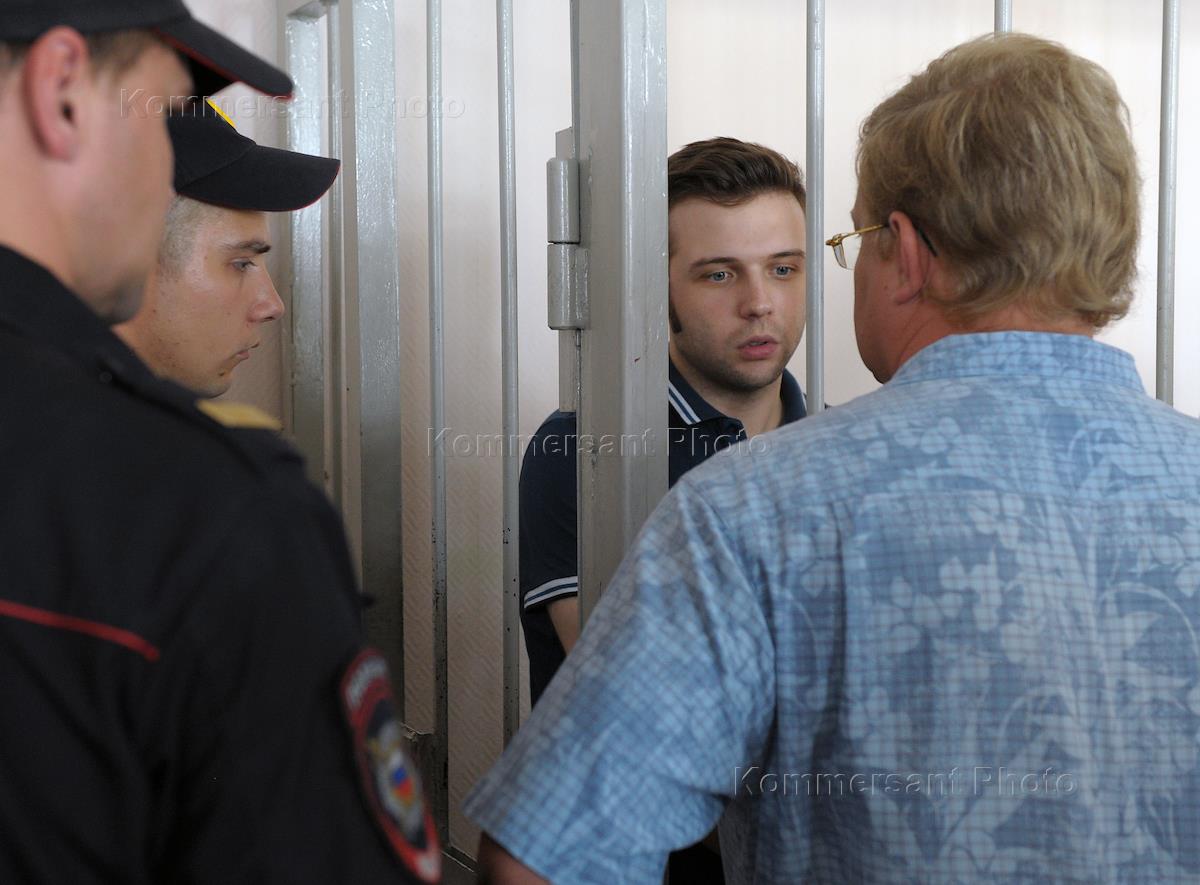 Прения сторон по уголовному делу о массовых беспорядках на Болотной площади 6 мая 2012 года прошли в Замосковрецком рйаонном суде. Обвиняемые в беспорядках на Болотной площади 6 мая 2012 года: издатель Александр Марголин (в центре) и активист движения "Антифа" Алексей Гаскаров (справа) во время заседания суда.