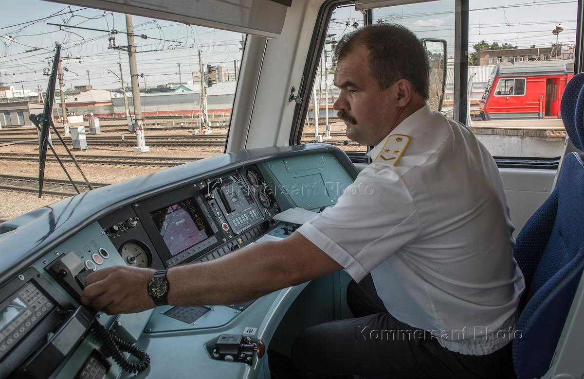 Машинист в кабине нового поезда Центральной пригородной компании на Савеловском вокзале.