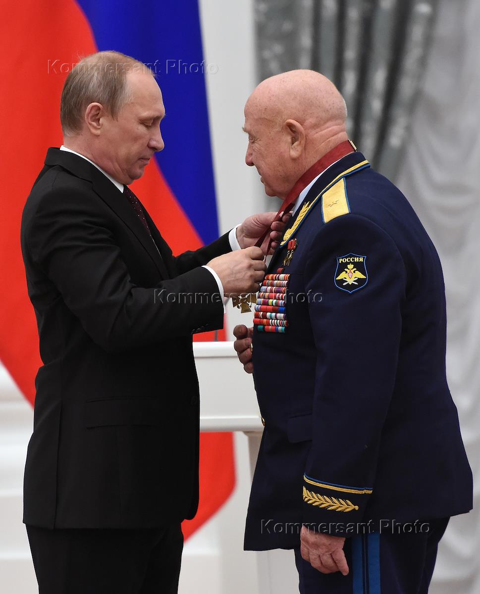 Церемония вручения государственных наград России прошла в Кремле. Президент России Владимир Путин (слева) и летчик-космонавт Алексей Леонов (справа) во время церемонии.