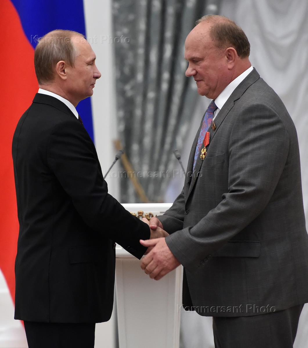 Церемония вручения государственных наград России прошла в Кремле. Президент России Владимир Путин (слева) и лидер Коммунистической партии России (КПРФ) Геннадий Зюганов (справа) во время церемонии.