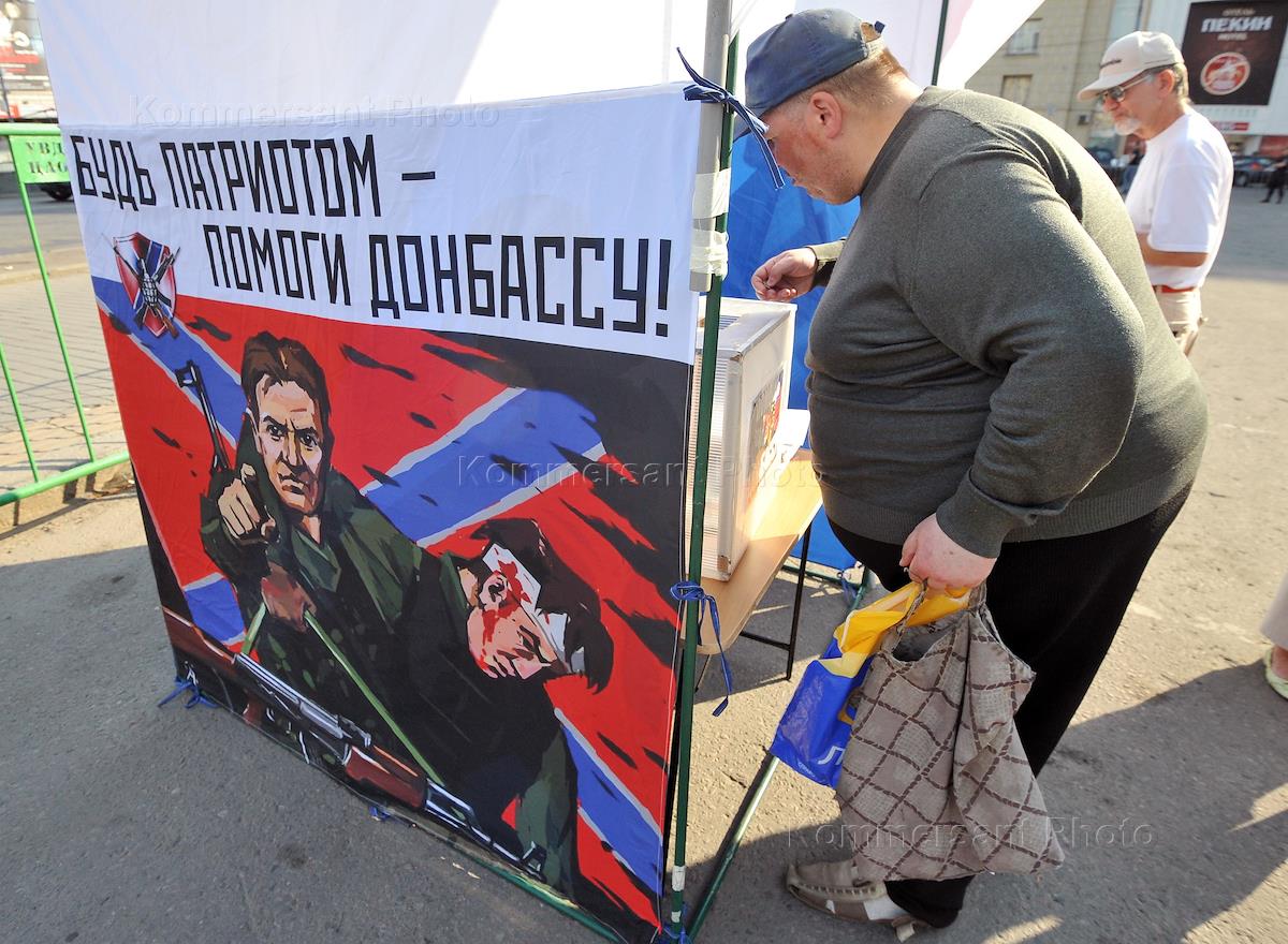 Акция "Стратегия-31" в защиту свободы собраний прошла на Триумфальной площади. Плакат "Будь патриотом - помоги Донбассу!". Сбор средств в помощь Донбассу.