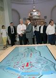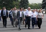 Празднованичные мероприятия, приуроченные 75-летнему юбилею Выставке достижений народного хозейства (ВДНХ). Заместитель мэра Москвы в правительстве Москвы по вопросам жилищно-коммунального хозяйства и благоустройства Петр Бирюков (справа), мэр Москвы Сергей Собянин (третий слева) и генеральный директор ОАО "ВДНХ" Владимир Погребенко (в центре) во время осмотра Центарльного павильона.
