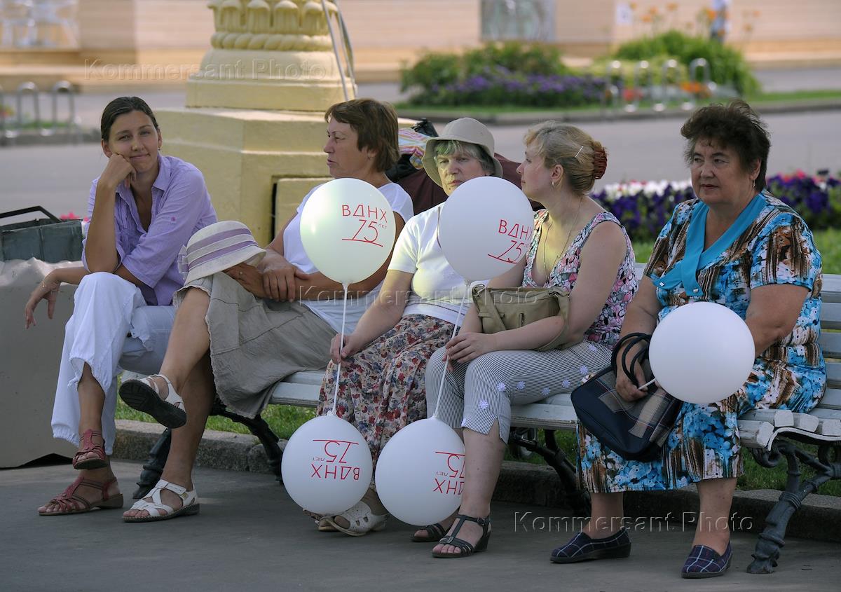 Празднованичные мероприятия, приуроченные 75-летнему юбилею Выставке достижений народного хозейства (ВДНХ). Отдыхающие на ВДНХ.