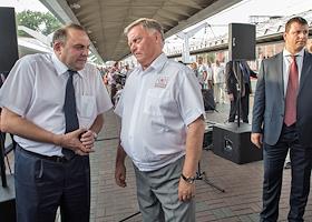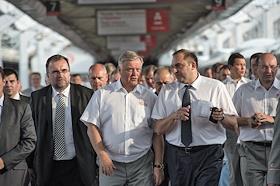 Президент ОАО "Российские железные дороги" (РЖД) Владимир Якунин (справа) во время торжественного мероприятия, посвященного отправлению в первый рейс сдвоенного состава высокоскоростного поезда "Сапсан", на Ленинградском вокзале.