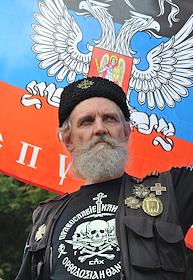 Согласованный митинг, организованный общественным движением "Битва за Донбасс", в поддержку Новороссии прошел на пересечении улицы Дурова и Олимпийского проспекта. Участник митинга - активист Союза православных хоругвеносцев.