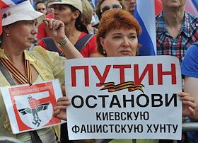 Согласованный митинг, организованный общественным движением "Битва за Донбасс", в поддержку Новороссии прошел на пересечении улицы Дурова и Олимпийского проспекта. Плакат "Нет фашизму на Украине!".