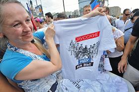 Согласованный митинг, организованный общественным движением "Битва за Донбасс", в поддержку Новороссии прошел на пересечении улицы Дурова и Олимпийского проспекта. Участница митинга держит футболку с надписью "Русские, иду на вы!".