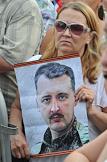 Согласованный митинг, организованный общественным движением "Битва за Донбасс", в поддержку Новороссии прошел на пересечении улицы Дурова и Олимпийского проспекта. Участница митинга с портретом одного из лидеров непризнанной Донецкой Народной Республики Игоря Стрелкова.