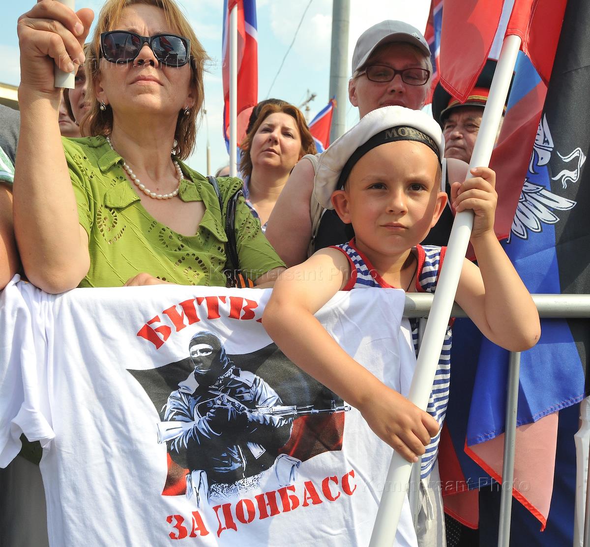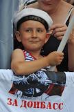 Согласованный митинг, организованный общественным движением "Битва за Донбасс", в поддержку Новороссии прошел на пересечении улицы Дурова и Олимпийского проспекта. Мальчик в бескозырке "Морячок" и футболка с надписью "За Донбасс!".