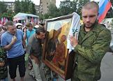 Согласованный митинг, организованный общественным движением "Битва за Донбасс", в поддержку Новороссии прошел на пересечении улицы Дурова и Олимпийского проспекта. Участники митинга прикладываются к Смоленской иконе Божией Матери Одигитрия - эта святыня помогала русским войнам в битве при Бородино, а сейчас отправится на Донбасс.