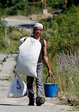 Жанровая фотография. Мужчина несет продукты в мешках через плечо и в ведре.