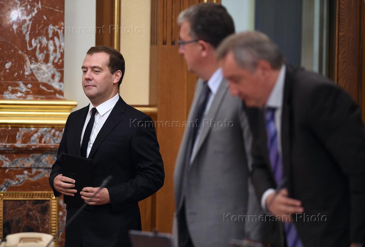 Заседание правительства России. Слева направо: председатель правительства России Дмитрий Медведев, заместитель председателя правительства России - руководитель аппарата правительства России Сергей Приходько и заместитель председателя правительства России Дмитрий Рогозин перед началом заседания.