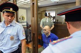 Обвиняемый по делу в причастности к убийству грузинского генерала Романа Думбадзе Александр Беришвили (справа) во время оглашения приговора в Мосгорсуде.