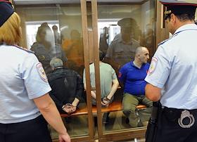 Слева направо: обвиняемые по делу в причастности к убийству грузинского генерала Романа Думбадзе Роман Белкания, Торнике Квирикашвили и Александр Беришвили во время оглашения приговора в Мосгорсуде.
