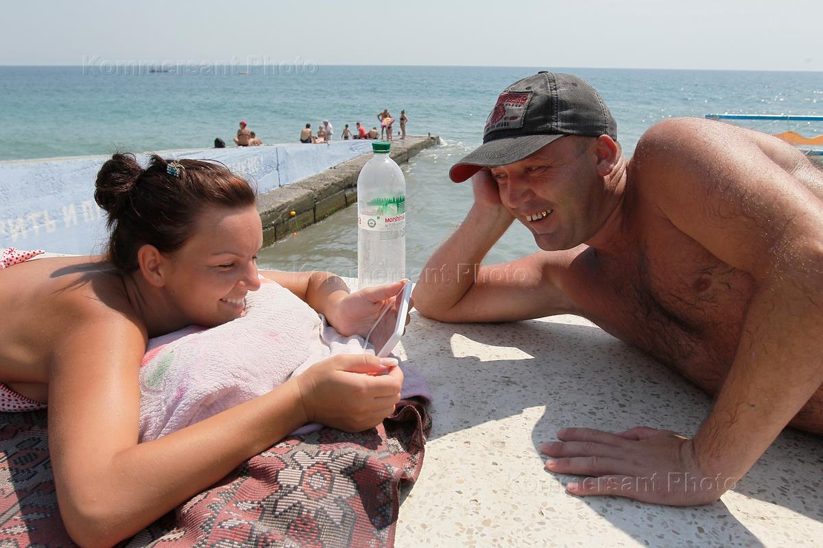 Жанровая фотография. Отдыхающие на пляже с мобильным телефоном и планшетным компьютером.