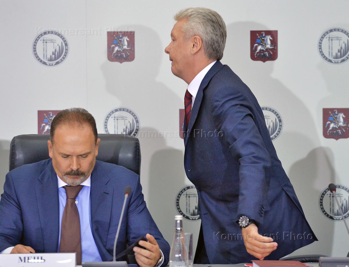 Министр строительства и жилищно-коммунального хозяйства России Михаил Мень (слева) и мэр Москвы Сергей Собянин (справа) на заседании Коллегии Комплекса градостроительной политики и строительства города Москвы, в рамках которой состоялась презентация экспозиции с архитектурным макетом центральной части Москвы. Презентация прошла на Выставке достижений народного хозяйства (ВДНХ).