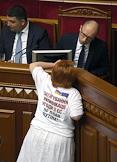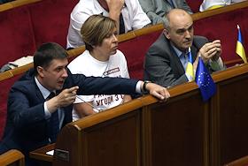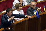Народные депутаты от фракции "БЮТ" Верховной Рады Украины (ВРУ) Вячелав Кириленко (слева) и Ксения Ляпина (в центре) во время заседания ВРУ.