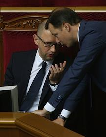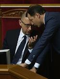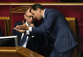 Председатель правительства Украины Арсения Яценюк (слева) и народный депутат Верховной Рады Украины (ВРУ) Олег Ляшко (справа) во время заседания ВРУ.