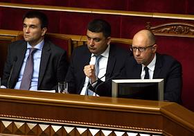 Заседание Верховной Рады Украины (ВРУ). Слева направо: министр иностранных дел Украины Павел Климкин, заместитель председателя правительства Украины Владимир Гройсман и председатель правительства Украины Арсений Яценюк во время заседания ВРУ.