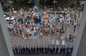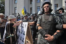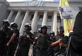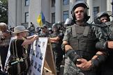 Сотрудники милиции во время охраны порядка на акции в поддержку введения санкций против России. Акция прошла на площади у здания Верховной Рады Украины.