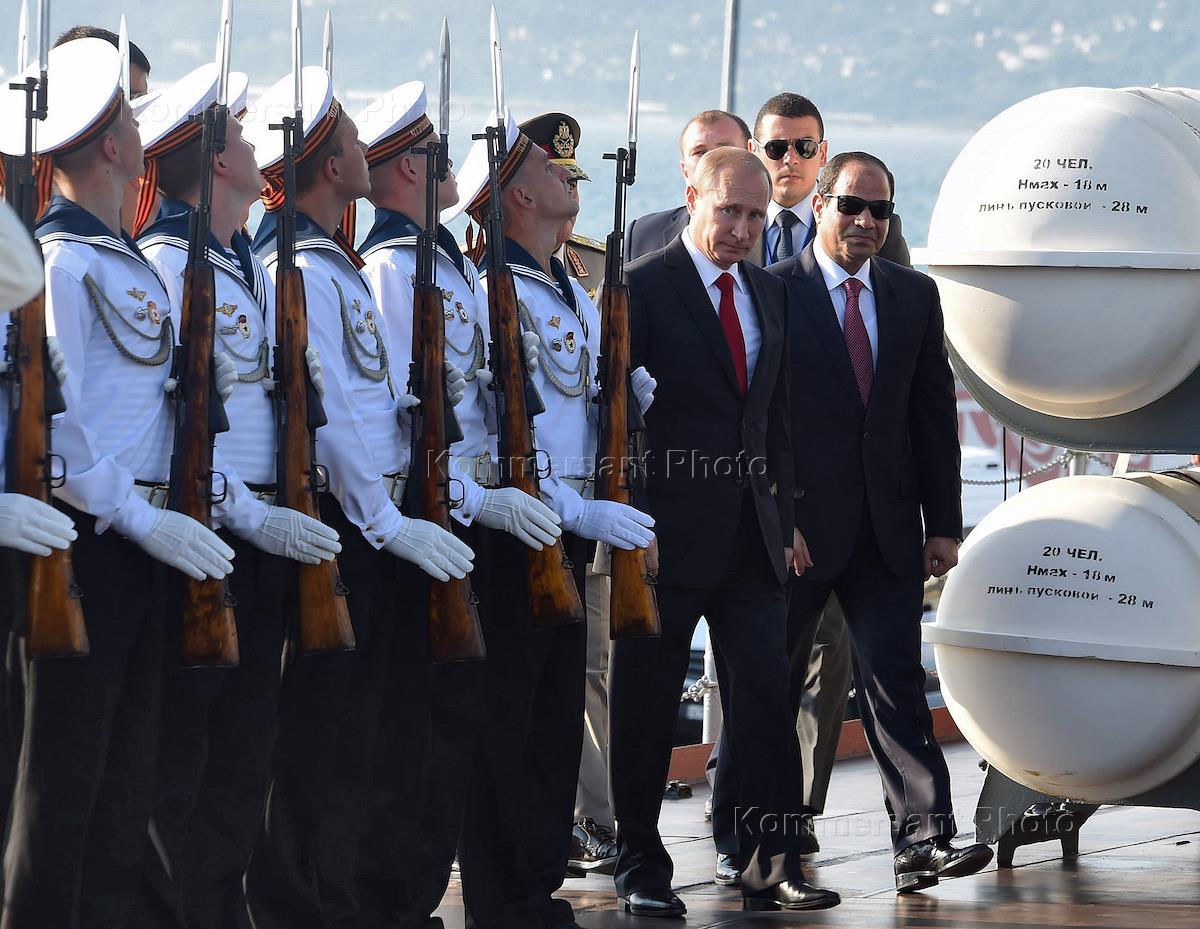 Президент России Владимир Путин (слева) и президент Египта Абдель Фаттах ас-Cиси (справа) во время посещения гвардейского ракетного крейсера "Москва" Черноморского флота в Морском порту Сочи.