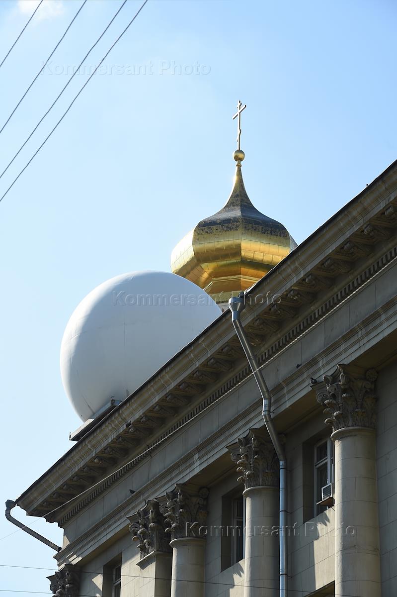 Виды Москвы. Надувной шар на крыше дома и крест на храме.