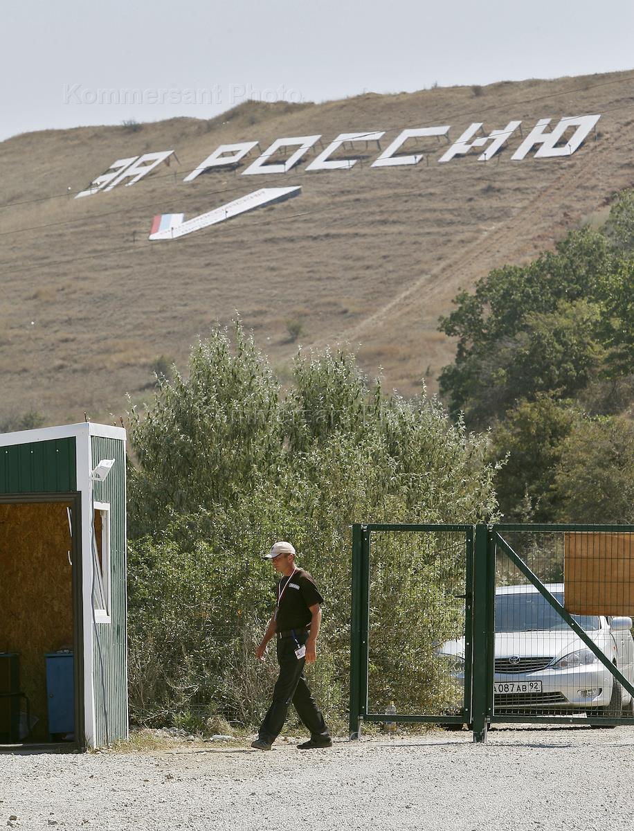The International youth forum 'Tavrida'. A participant of the forum is in the background of an advertisement of the merchandise mark 'Bukhta udachi' (The bay of luck).