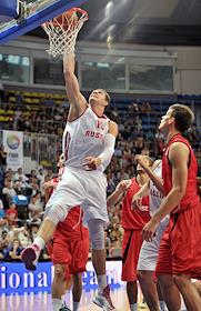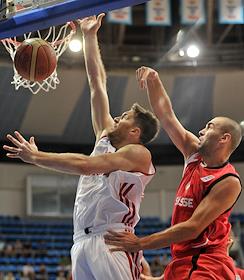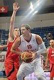 Чемпионат Европы по баскетболу 2014. Квалификационный турнир. Матч между сборными командами России и Швейцарии прошел во дворце спорта "Динамо" в Крылатском. Баскетболист Тимофей Мозгов во время матча.