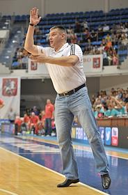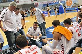 Чемпионат Европы по баскетболу 2014. Квалификационный турнир. Матч между сборными командами России и Швейцарии. Главный тренер мужской сборной команды России по баскетболу Евгений Пашутин (в центре) во время матча. Матч прошел во Дворце спорта "Динамо" в Крылатском