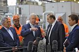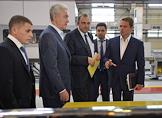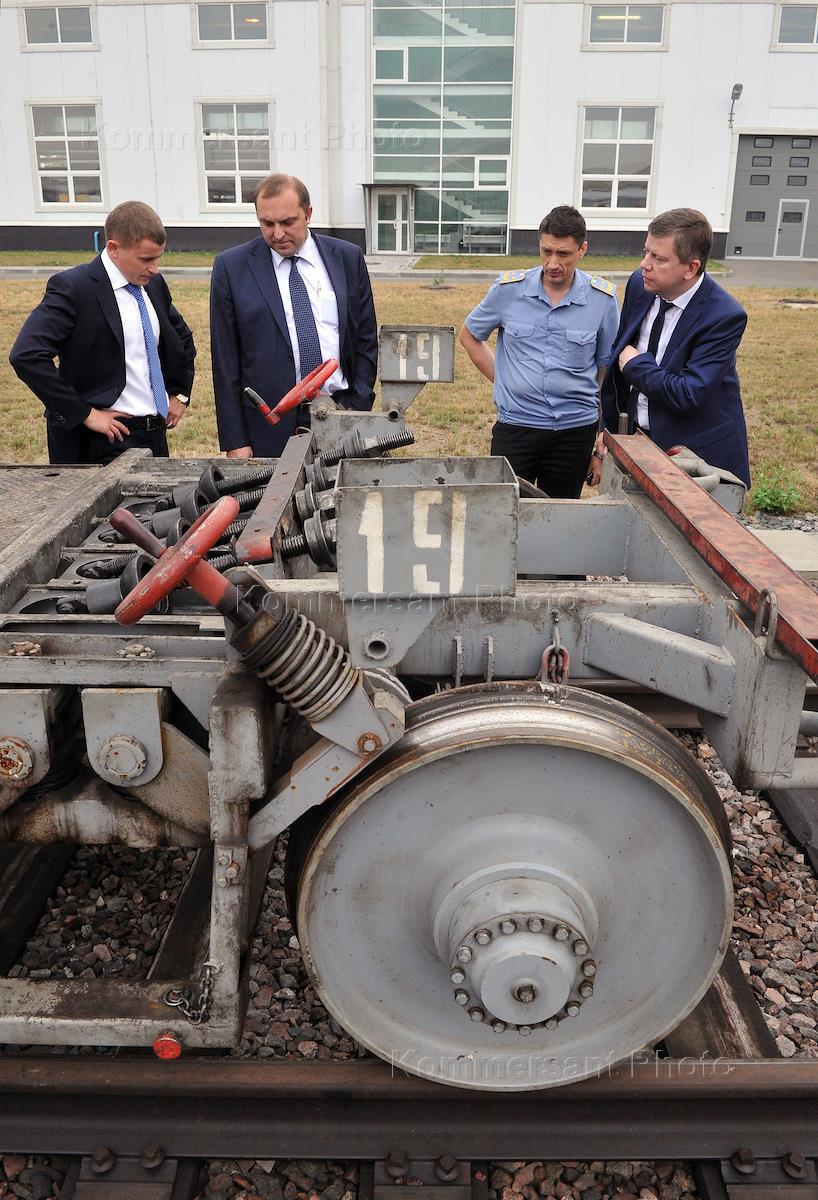 Руководитель департамента транспорта и развития дорожно-транспортной инфраструктуры города Москвы Максим Лискутов (в центре) и начальник ГУП "Московский метрополитен" Дмитрий Пегов (второй слева) во время посещения электродепо "Печатники".