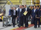 Руководитель департамента транспорта и развития дорожно-транспортной инфраструктуры города Москвы Максим Лискутов (справа), начальник ГУП "Московский метрополитен" Дмитрий Пегов (в центре) и мэр Москвы Сергей Собянин (второй слева) во время посещения электродепо "Печатники".