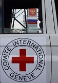 Автомобиль Красного Креста, который сопровождает колонну автомобилей "КамАЗ" с гуманитарной помощью для жителей юго-востока Украины.