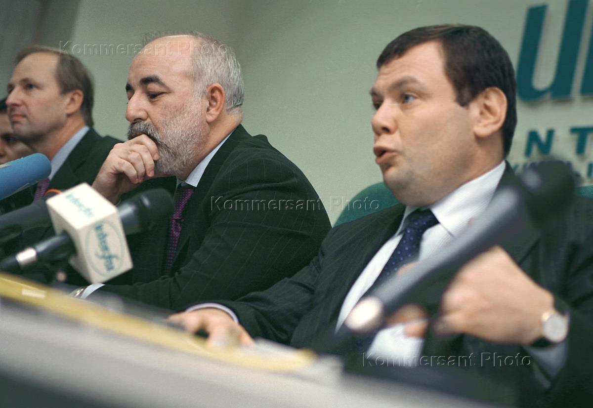 Вице-президент группы "BP" Роберт Дадли (слева), председатель совета директоров "Ренова" Виктор Вексельберг (в центре) и президент "Альфа-банка" Михаил Фридман (справа) во время пресс-конференции о создании компаниями "Альфа-Групп", Access/Renova и BP нового нефтяного холдинга в России. Пресс-конференция состоялась в агентстве "Интерфакс".