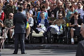 Раненые во время участия в антитеррористической операции (АТО) на юго-востоке Украины военнослужащие, на военном параде в честь Дня независимости Украины. Парад прошел на Майдане Незалежности (Площади Независимости).