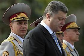Министр обороны Валерий Гелетей (слева) и президент России Петр Порошенко (в центре) на военном параде в честь Дня независимости Украины. Парад прошел на Майдане Незалежности (Площади Независимости).