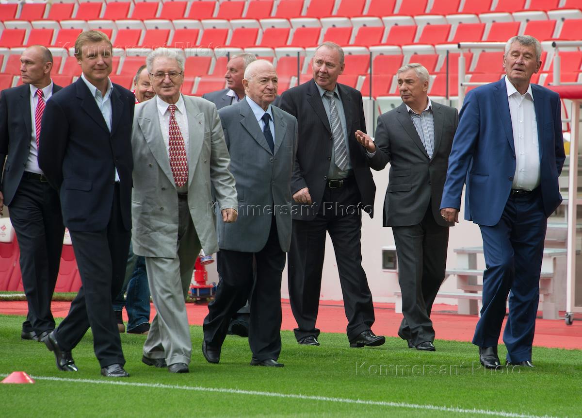 Стадион "Открытие Арена"- домашний стадион футбольного клуба "Спартак-Москва" в Тушино. Слева направо: президент Академии имени Федора Черенкова московского "Спартака" Сергей Родионов, футболист Владимир Бесчастных, председатель Комитета ветеранов Российского футбольного Союза (РФС) Алексей Парамонов, первый вице-президент Российского футбольного союза (РФС) Никита Симонян, тренеры по футболу Олег Романцев и Георгий Ярцев во время посещения стадиона.