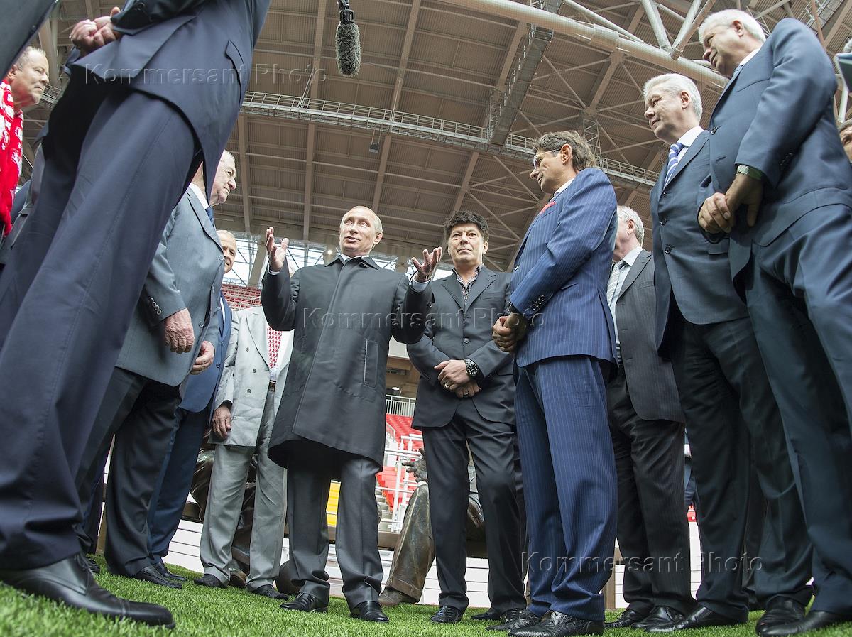 Стадион "Открытие Арена"- домашний стадион футбольного клуба "Спартак-Москва" в Тушино. Президент России Владимир Путин (в центре), ректор Академии футбола и вратарского искусства Ринат Дасаев (пятый справа), председатель совета директоров московского футбольного клуба "Спартак" Леонид Федун (четвертый справа), мэр Москвы Сергей Собянин (второй справа) во время посещения стадиона.