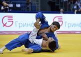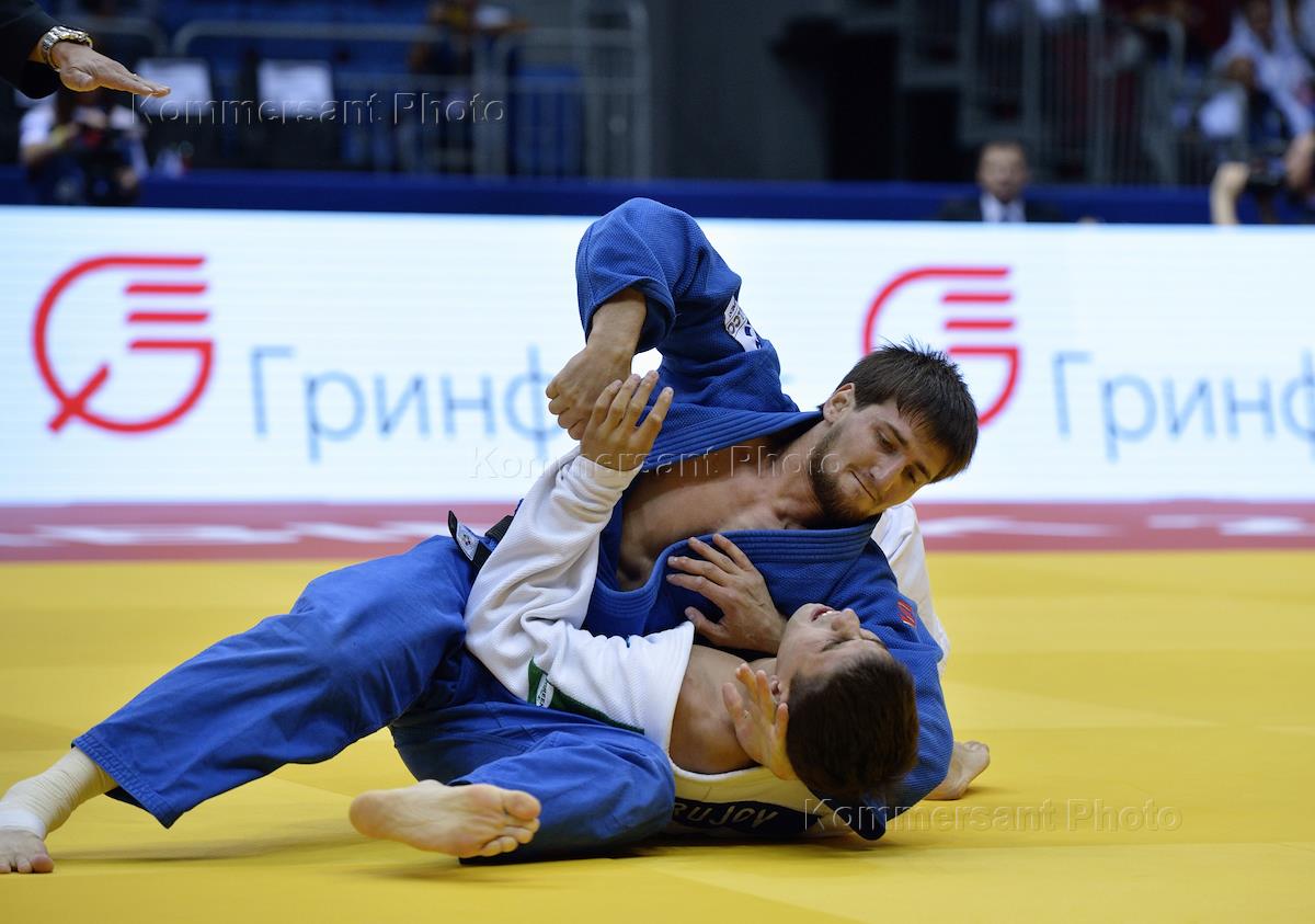 Чемпионат мира по дзюдо-2014 в Челябинске. Личные соревнования спортсменов в категории до 73 кг. Матч за третье место между Ертуганом Тореновым (Казахстан) (снизу) и Мусой Могушковым (Россия)(сверху).