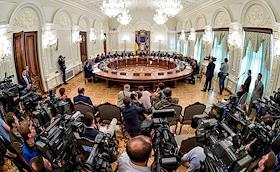Справа налево: премьер-министр Украины Арсений Яценюк, президент Украины Петр Порошенко и председатель Верховной рады Украины Александр Турчинов во время заседания Совета национальной безопасности и обороны Украины.