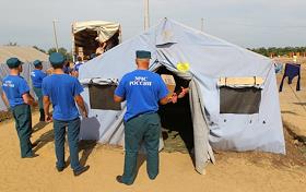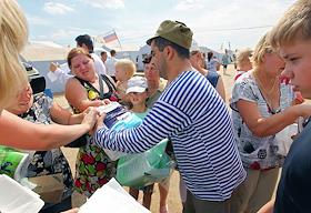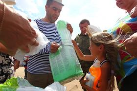 Лагерь временного содержания украинских беженцев. Сотрудники МЧС России во время раздачи гуманитарной помощи беженцам.