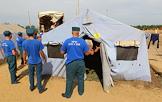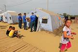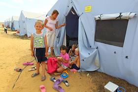 Лагерь временного содержания украинских беженцев. Женщина с детьми у входа в одну из палаток лагеря.