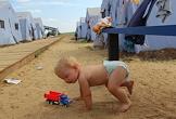 Лагерь временного содержания украинских беженцев. Маленький ребенок в подгузнике играет рядом с палаткой в лагере.