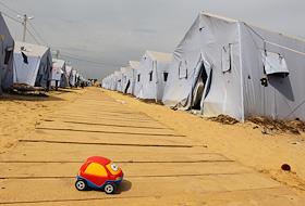 Лагерь временного содержания украинских беженцев. Палатки беженцев. Детская игрушка на деревянном настиле лагеря.